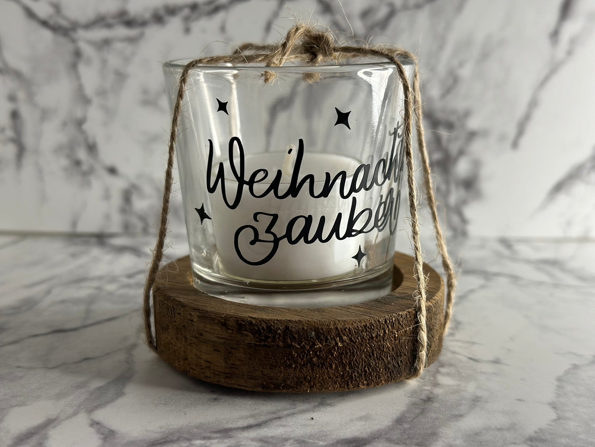 Teelichthalter mit Holzsockel mit der Aufschrift „Winterzauber“. Zum dekorieren für den Tisch , Sidboard uvm.