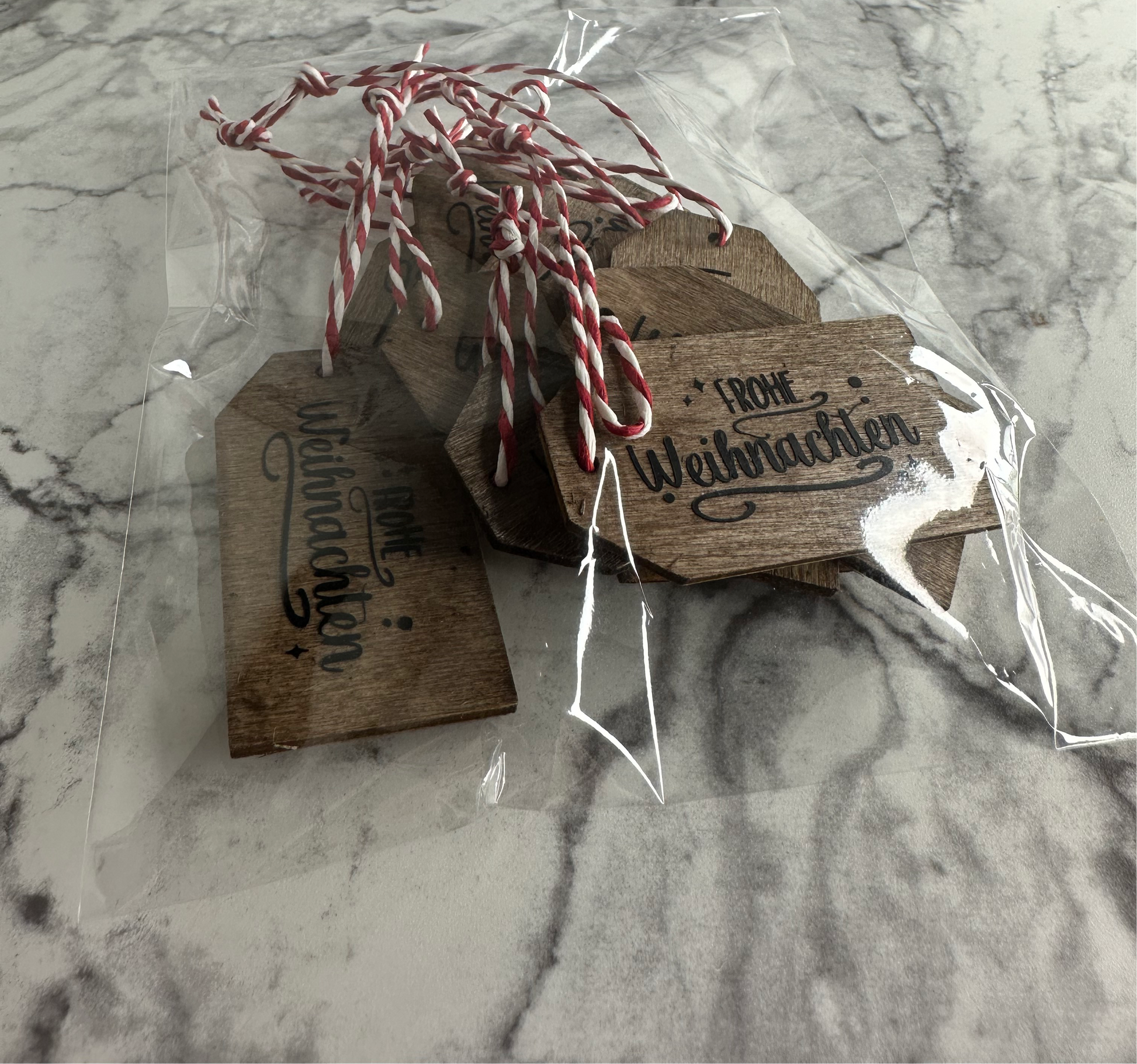 Schöne selbst eingefärbte Holzanhänger für Geschenke und kleine Mitbringsel.