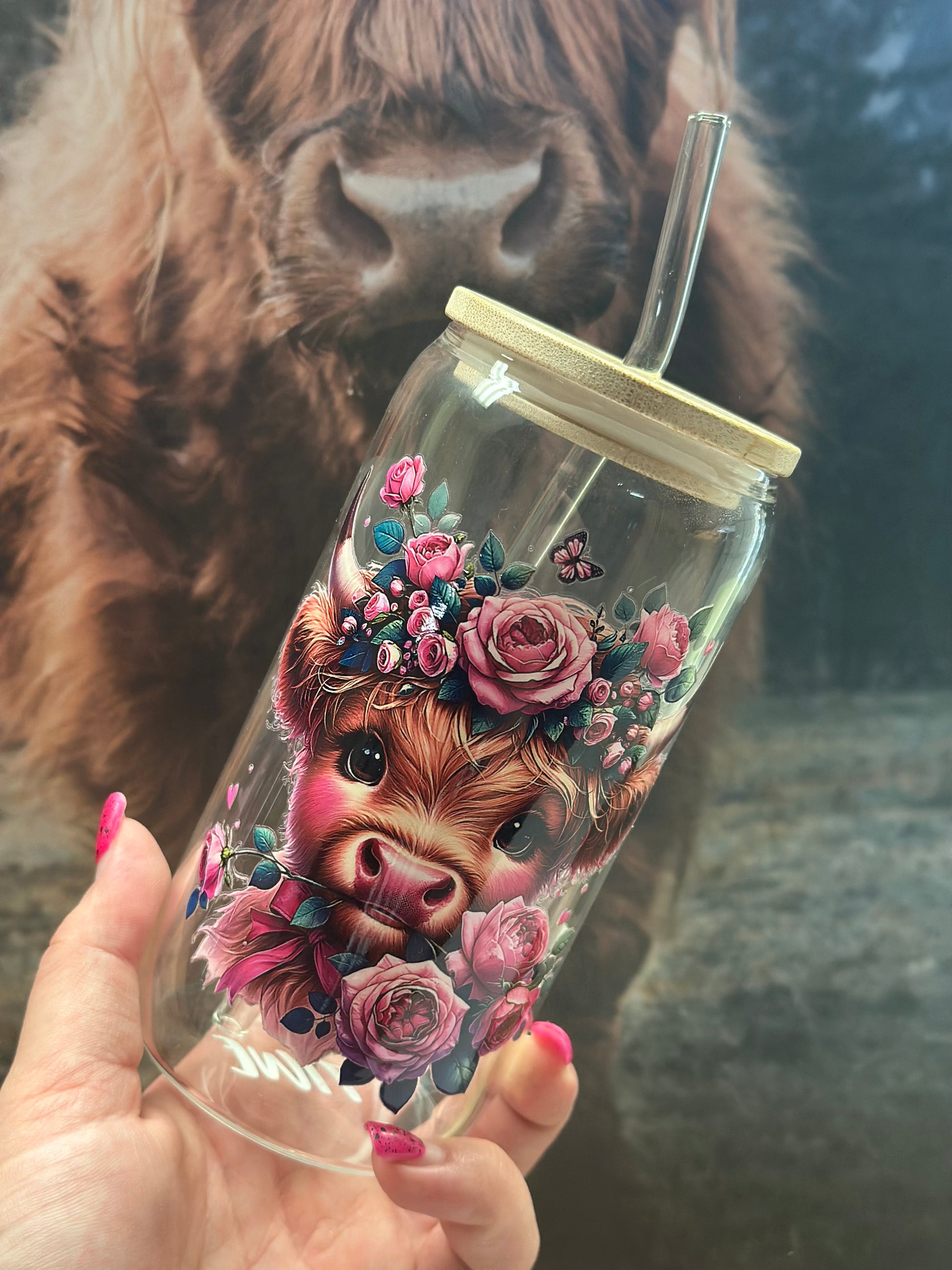 Trinkglas mit Bambusdeckel „Blumen Kuh“