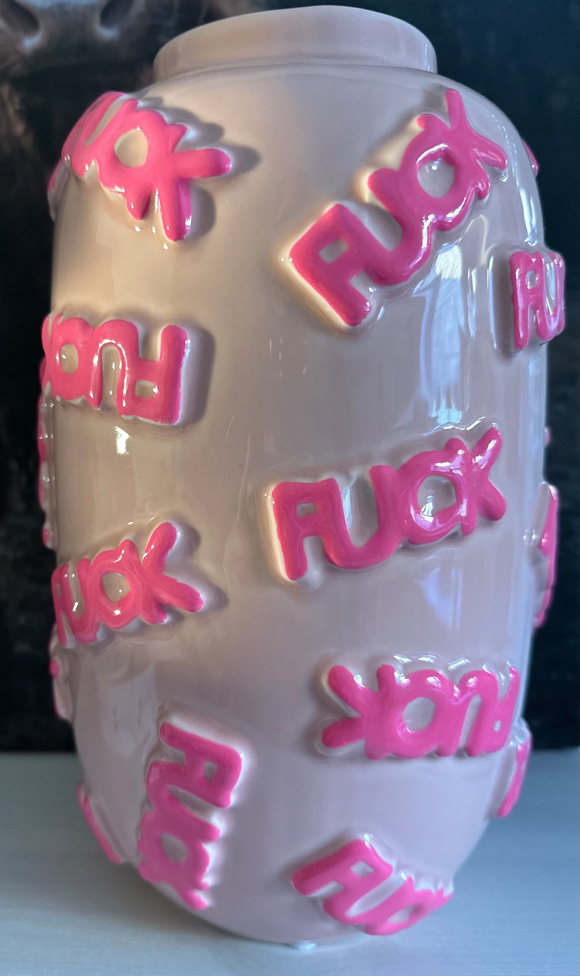 Coole Vase in Rosa/Pink mit ganz viel Fuck Fuck Fuck als Statement darauf.